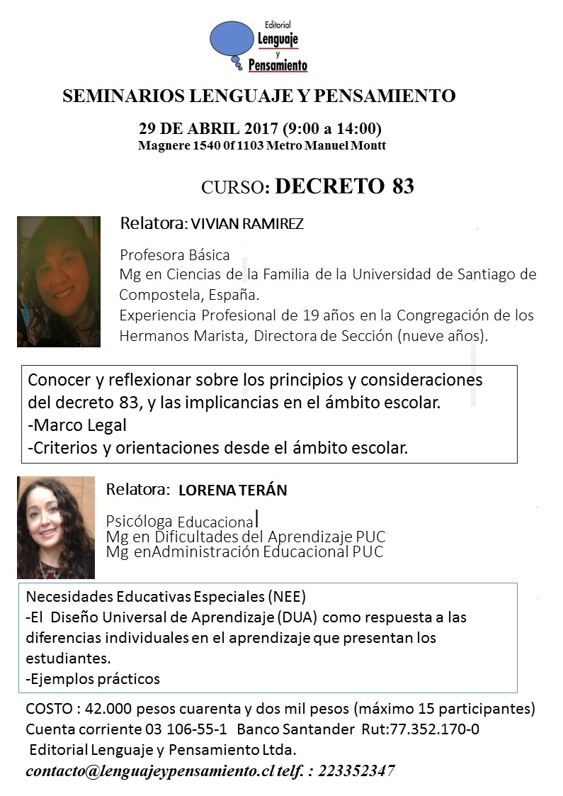 Este curso taller tiene como propósito conocer y reflexionar sobre los principios y consideraciones del Decreto 83 y las implicancias en el ámbito escolar además, ejemplos prácticos del Diseño Universal de Aprendizaje (DUA) en la sala de clases, relacionados con el lenguaje